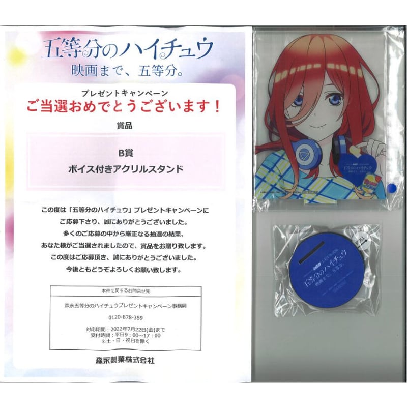 - キャラクターグッズ > アクリルスタンド > 五等分の花嫁 五等分のハイチュウ B賞 ボイス付きアクリルスタンド 三玖 当選書付き 五等分のハイチュウ プレゼントキャンペーン B賞 ボイス